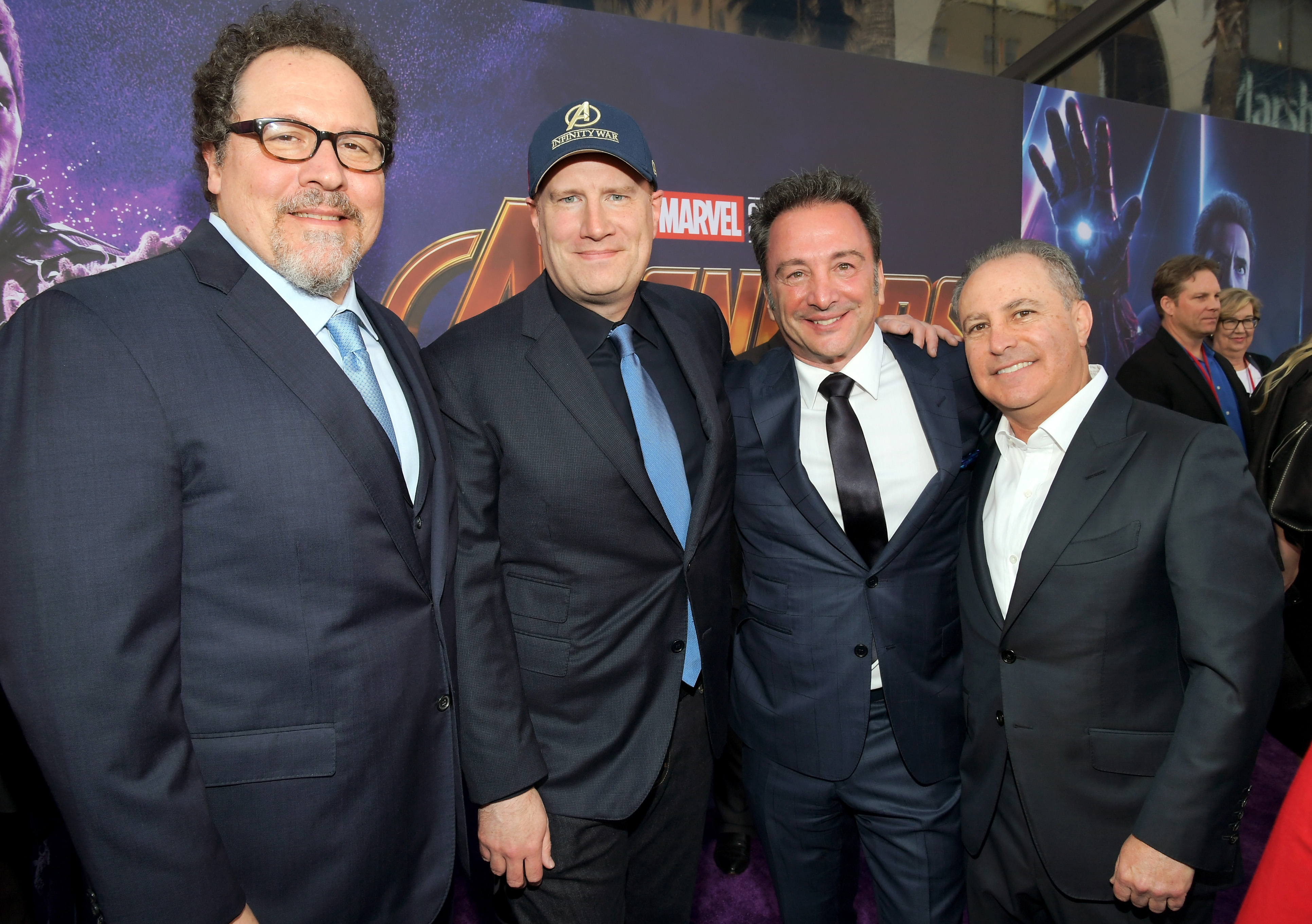 HOLLYWOOD, CA – APRIL 23: (L-R) Producer Jon Favreau, President of Marvel Studios and Producer Kevin Feige, Marvel Studios Co-President Louis D’Esposito, and Walt Disney Studios President Alan Bergman attend the Los Angeles Global Premiere for Marvel Studios Avengers: Infinity War on April 23, 2018 in Hollywood, California. (Photo by Charley Gallay/Getty Images for Disney) *** Local Caption *** Kevin Feige; Louis D’Esposito; Jon Favreau; Alan Bergman