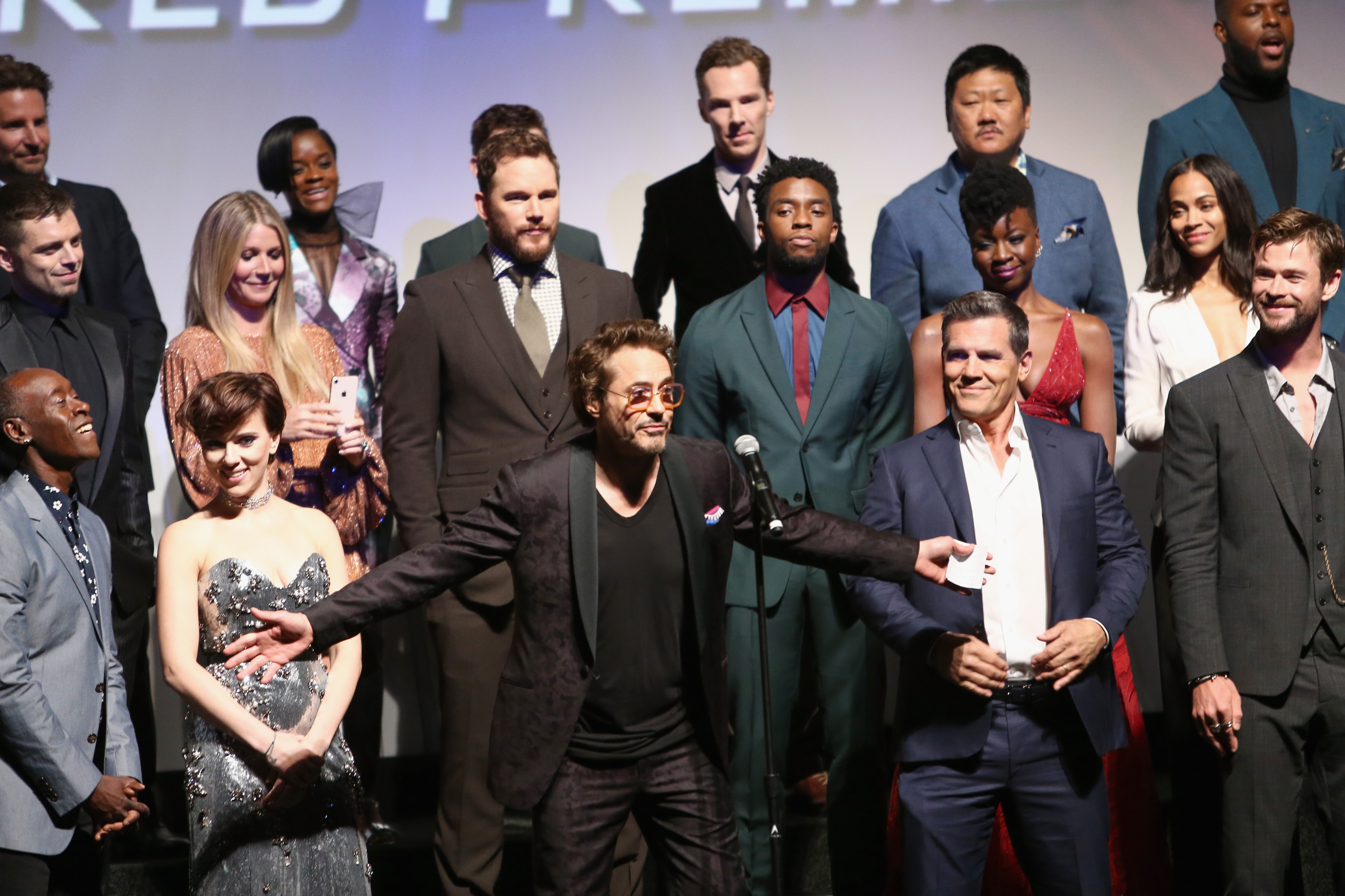 HOLLYWOOD, CA – APRIL 23: Actor Robert Downey Jr. and cast & crew of ‚Avengers: Infinity War‘ attend the Los Angeles Global Premiere for Marvel Studios’ Avengers: Infinity War on April 23, 2018 in Hollywood, California. (Photo by Rich Polk/Getty Images for Disney) *** Local Caption *** Robert Downey Jr.; Chris Pratt; Josh Brolin; Chris Hemsworth; Scarlett Johansson; Benedict Cumberbatch; Tom Holland; Elizabeth Olsen; Zoe Saldana; Karen Gillan; Mark Ruffalo; Vin Diesel; Dave Bautista; Paul Bettany; Sebastian Stan; Benedict Wong; Pom Klementieff; Terry Notary; Chadwick Boseman; Bradley Cooper; Paul Rudd; Letitia Wright; Gwyneth Paltrow