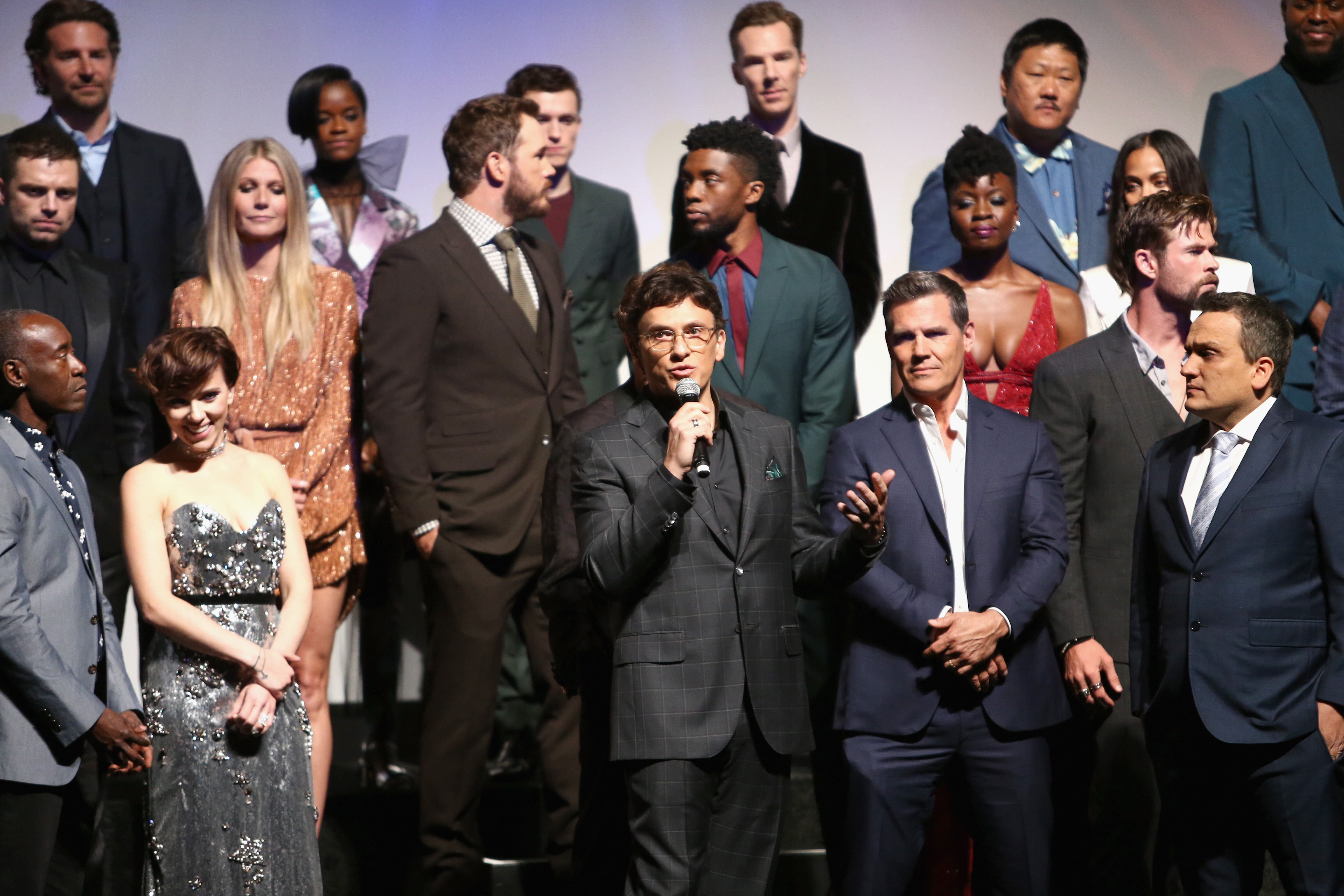 HOLLYWOOD, CA – APRIL 23: Directors Anthony Russo and Joe Russo and cast & crew of ‚Avengers: Infinity War‘ attend the Los Angeles Global Premiere for Marvel Studios Avengers: Infinity War on April 23, 2018 in Hollywood, California. (Photo by Rich Polk/Getty Images for Disney) *** Local Caption *** Joe Russo; Anthony Russo; Robert Downey Jr.; Chris Pratt; Josh Brolin; Chris Hemsworth; Scarlett Johansson; Benedict Cumberbatch; Tom Holland; Elizabeth Olsen; Zoe Saldana; Karen Gillan; Mark Ruffalo; Vin Diesel; Paul Bettany; Sebastian Stan; Chadwick Boseman; Bradley Cooper; Paul Rudd; Gwyneth Paltrow