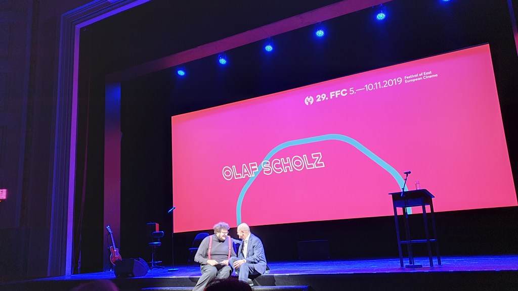 Wie ihr bereits auf dem Titelbild erkennen könnt, findet jedes Jahr die große Eröffnung im Herzen der Stadt, im strahlenden blau gehüllten Staatstheater Cottbus, statt. Viele Gäste aus Politik, Film und Gesellschaft waren auch dieses Jahr anwesend. Dazu zählen u.a. die ehemaligen Bürgermeister Waldemar Kleinschmidt und Frank Szymanski. Auch der aktuelle Bürgermeister Holger Kelch ließ es sich nicht nehmen, der Veranstaltung beizuwohnen. Vizekanzler und Finanzminister Olaf Scholz, der Vorsitzende des Deutsch-Russischen Forums Matthias Platzeck und Programmdirektor Bernd Buder hielten am Abend des 5. November 2019 Reden am Pult. Dabei ging es nicht nur um das Festival an sich, sondern auch um die Thematik des Mauerfalls im Jahre 1989. Durch die Moderation führte der deutsche Regisseur, Autor, Schauspieler und Produzent Axel Ranisch, der mit seiner lockeren und witzigen Art das Publikum unterhielt. Ledazzo sorgte mit sorbischen Songs für musikalische Unterhaltung.