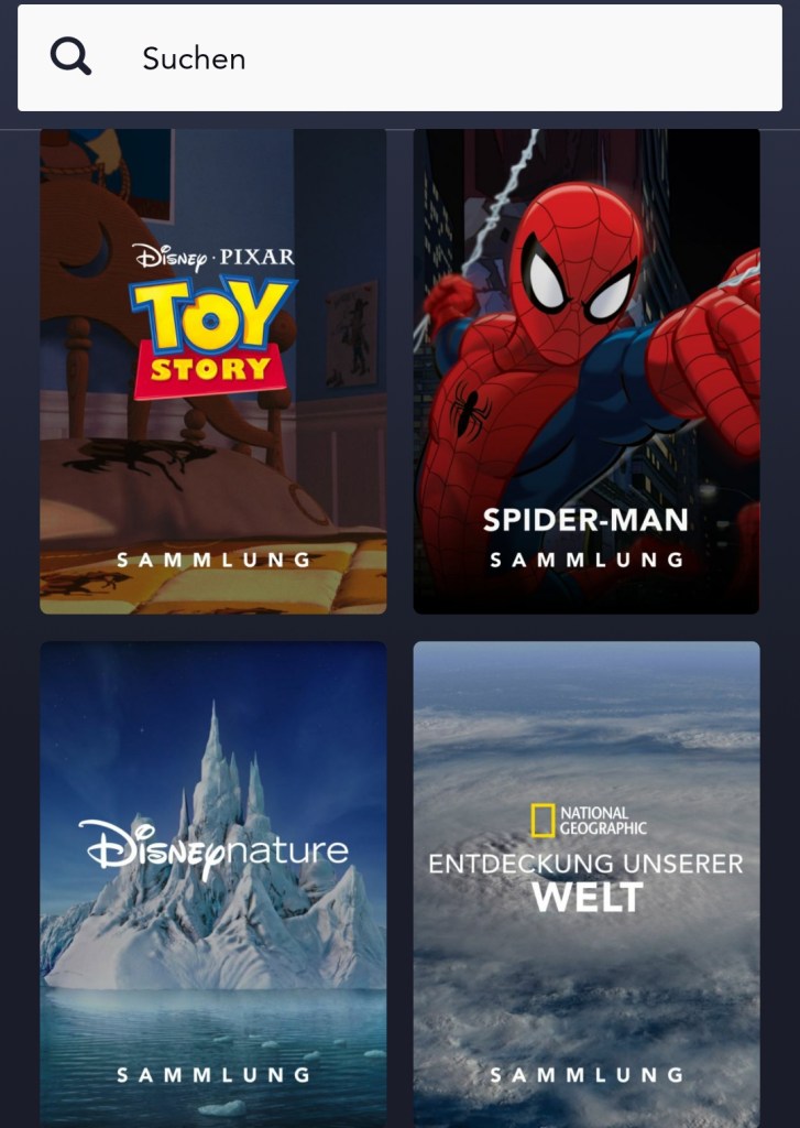 Wie schon im eigenen Profil findet man auch auf der Programmoberfläche eine schöne Übersicht. Ganz oben werden Hinweise gezeigt, die entweder für einen interessant sein könnten oder man bekommt eben Titel präsentiert, die neulich hinzugefügt wurden. Darunter können die einzelnen Sparten »Disney«, »Pixar«, »Marvel«, »Star Wars« oder auch »National Geographic« angewählt werden.