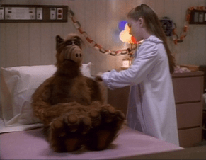 Alf ist im Begriff, das Krankenhaus unbemerkt zu verlassen. Jedoch muss er sich kurzerhand unter einem Laken eines Notbettes verstecken und landet so mit einer hochschwangeren Frau in einem Fahrstuhl, welcher zu allem Überfluss auch noch stecken bleibt. Dabei sollte sie rasch in den Kreißsaal gefahren werden. Nun ist guter Rat teuer, was zu tun ist.